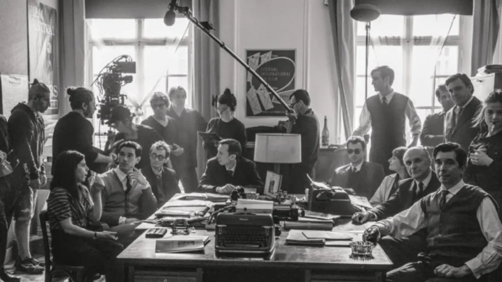 A diferencia de lo que vemos en la mayoría de las películas que narran procesos creativos de artistas, y más si son artistas incomprendidos que buscan hacerse un lugar en el tejido social (pienso ahora en Tik, tik… Boom!, con Andrew Garfield haciendo de Jonathan Larson, o en Un completo desconocido, con Timothée Chalamet haciendo de Bob Dylan), en Nouvelle vague vemos un artista que sí, le da importancia a lo que está haciendo, y sí, quiere hacerse un lugar en la trama colectiva (sus compañeros de la revista ya dirigieron sus películas y él no), pero lo hace de un modo, de nuevo, muy ligero.